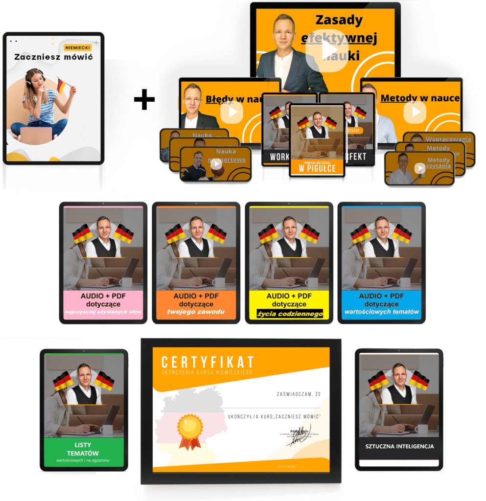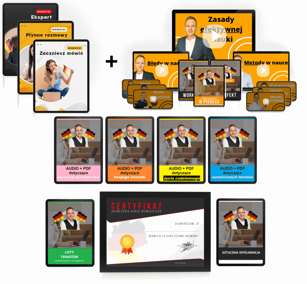 Otrzymujesz dostęp do program „Płynne rozmowy”(Język niemiecki od A do Z) Kurs zawiera: